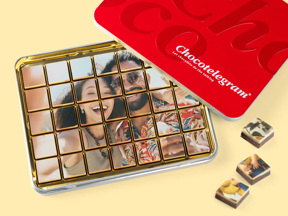 Skräddarsy en chokladupplevelse genom att lägga till ett foto från ett särskilt minne! Du kan ladda upp ett valfritt foto, kanske från senaste semestern, en favoritbild på ditt husdjur, eller en bild från en betydelsefull dag. Bilden trycks direkt på chokladen, så att varje bit blir en del av ett visuellt och smakfullt pussel.